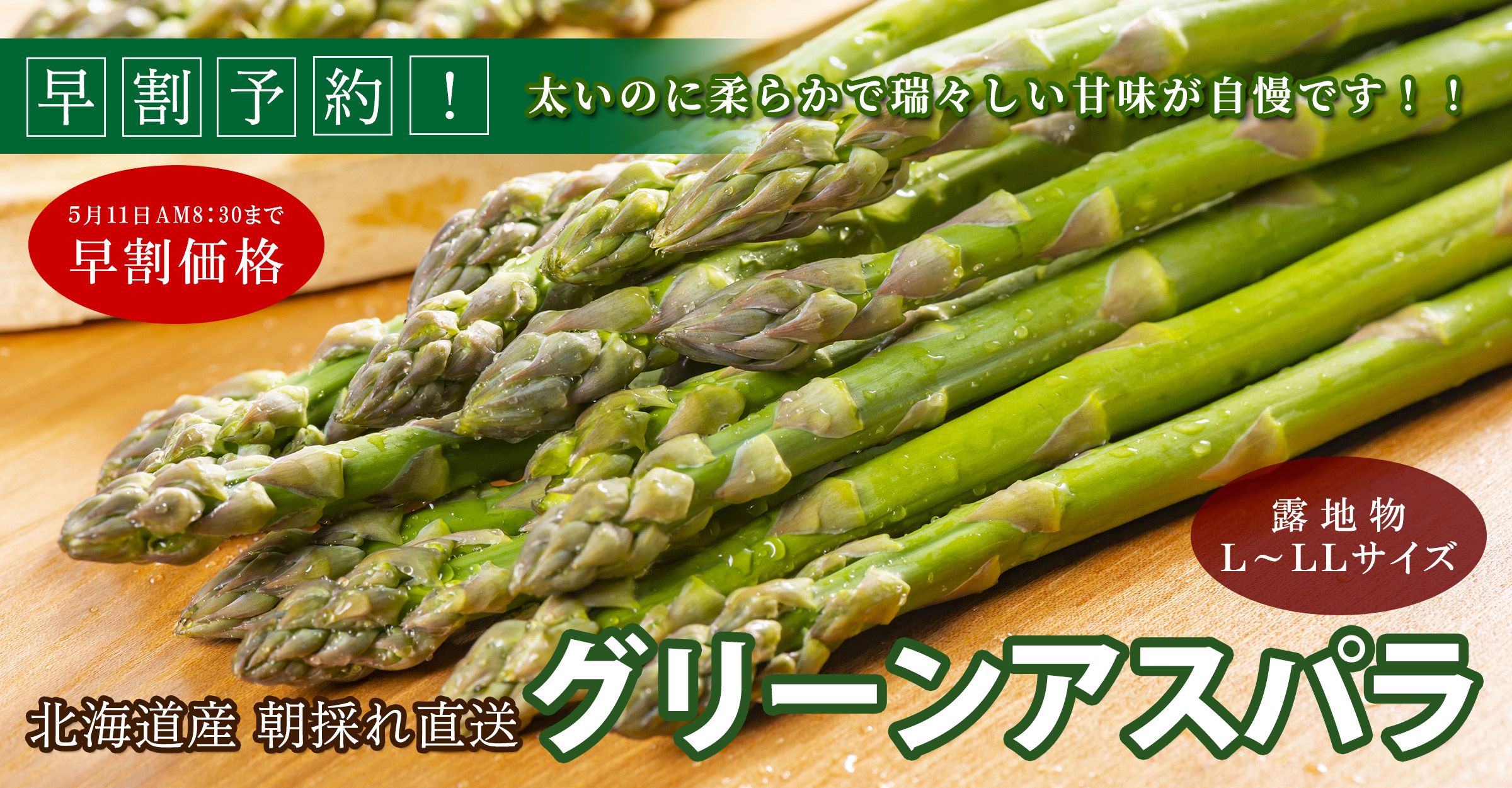 北海道産「露地物」グリーンアスパラの早割予約受付開始しました。