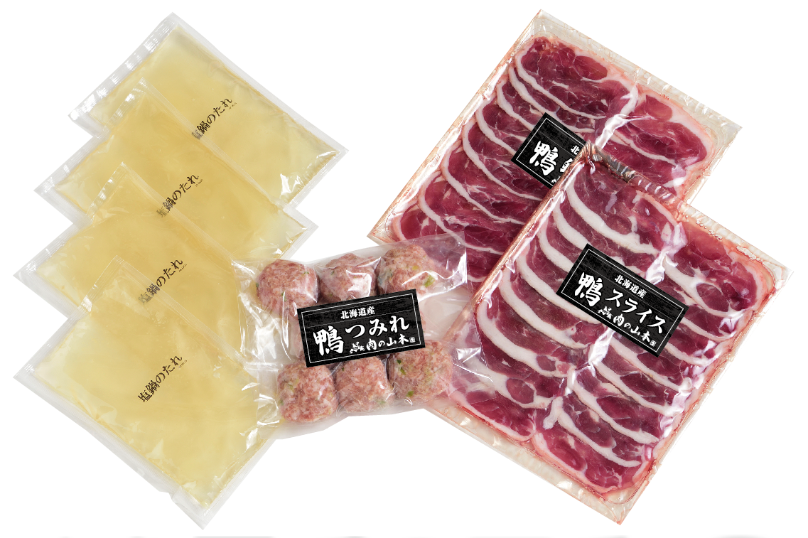北海道産鴨肉と、相性抜群のさっぱりとした塩味スープで食べるお鍋は絶品です!食べ終えた後のスープには旨味が溶け込み、素晴らしいお出汁になりますので、雑炊やうどん等でお楽しみください。- 内容量及び原産地