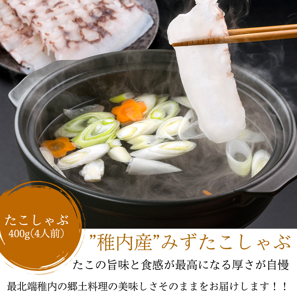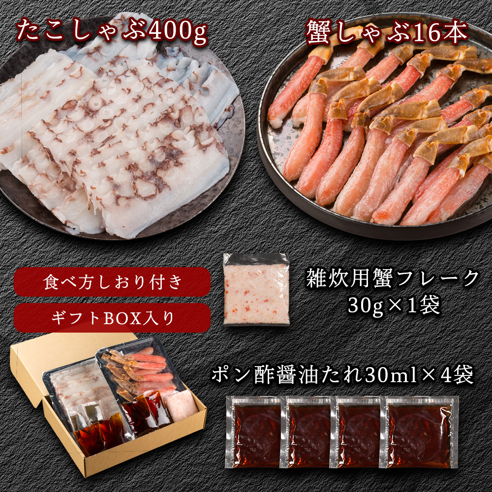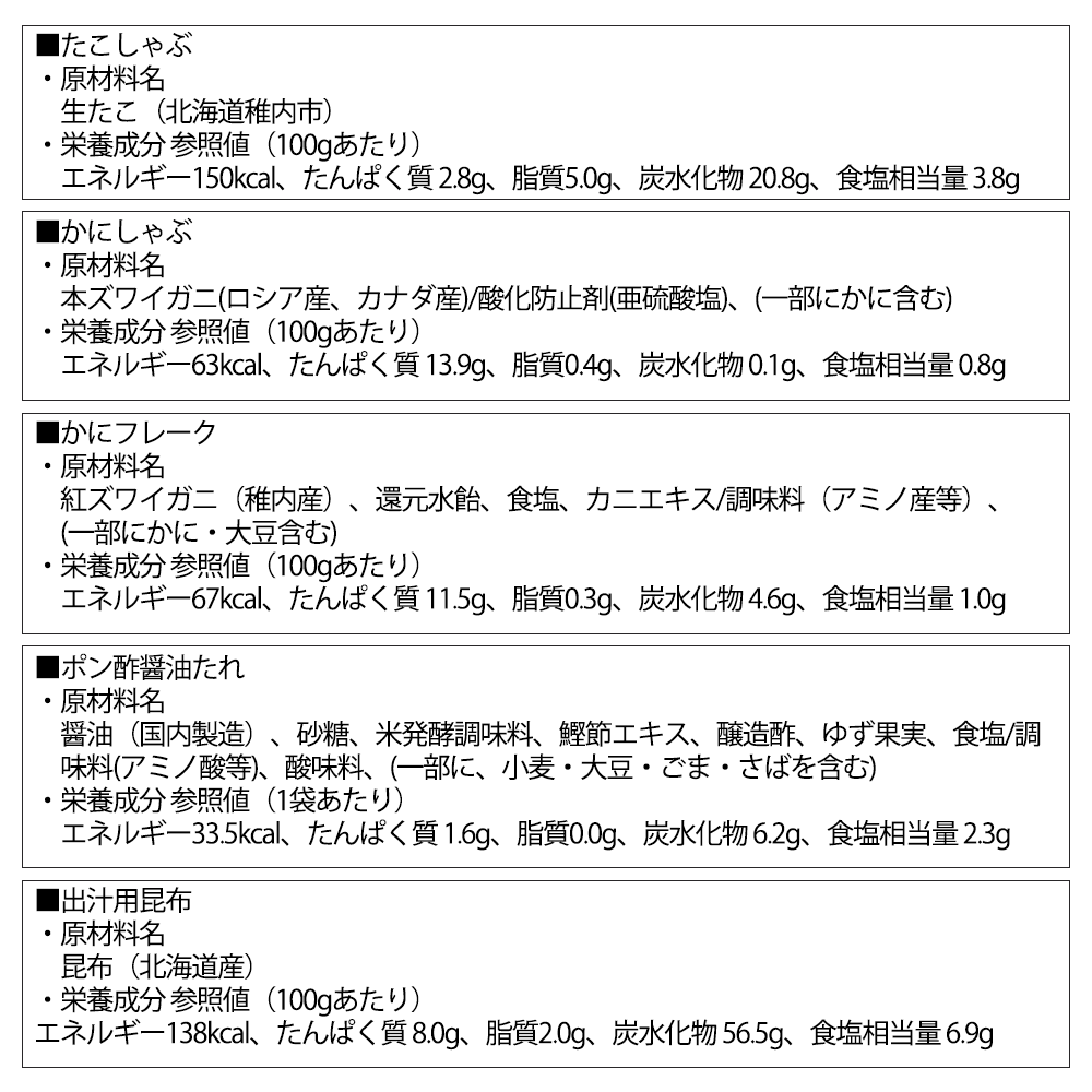 [内容量]かにしゃぶ16本(約400g)、たこしゃぶ400g、雑炊用蟹フレーク30g、ポン酢醤油たれ30ml×4袋、出汁用利尻昆布2個