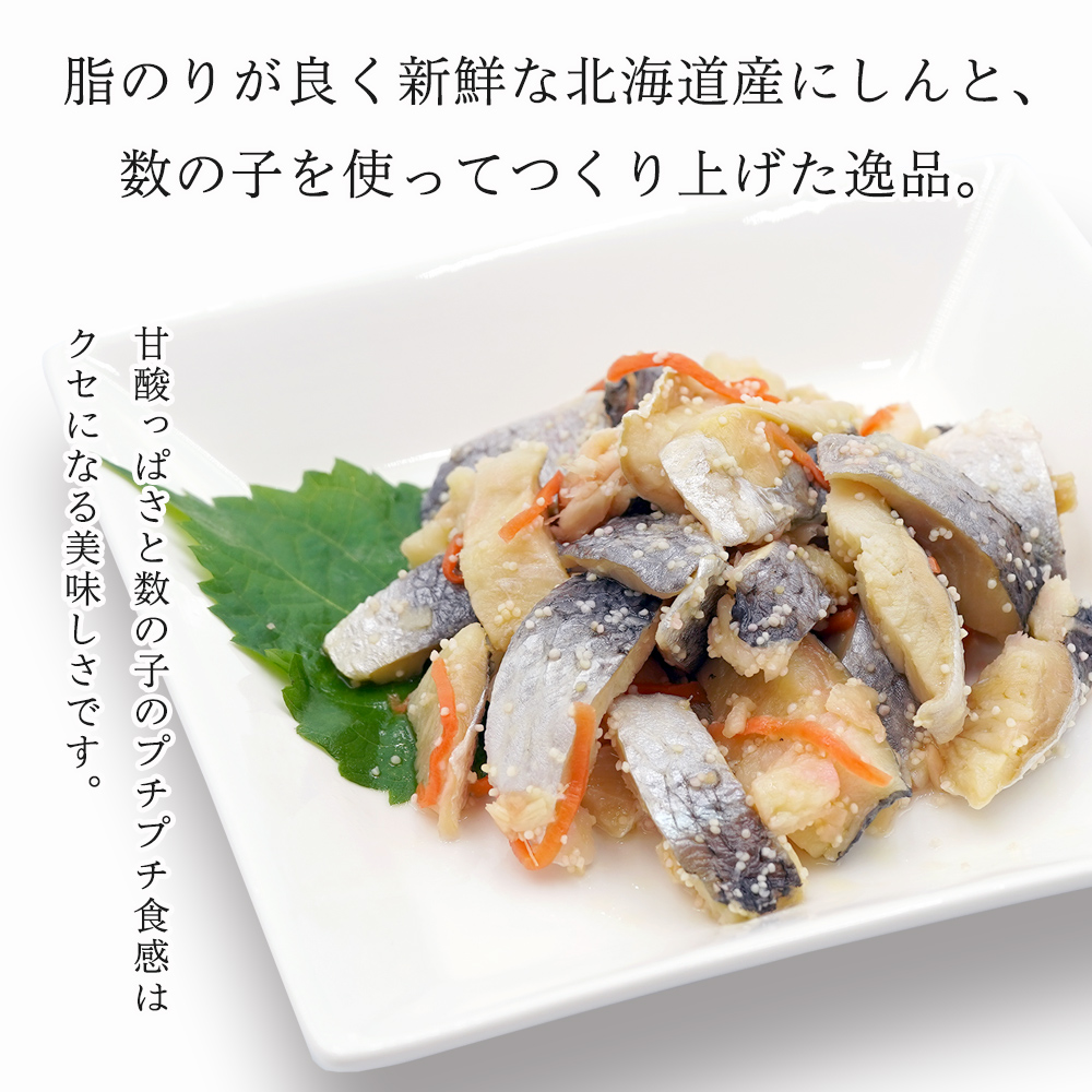 脂のりのよい新鮮な北海道産にしんを甘酢漬けにし、プチプチ食感の数の子を合わせた、にしんの「親子漬け」です。すっきりとした甘酸っぱい美味しさと、数の子のプチプチ弾ける食感はクセになる美味しさです。