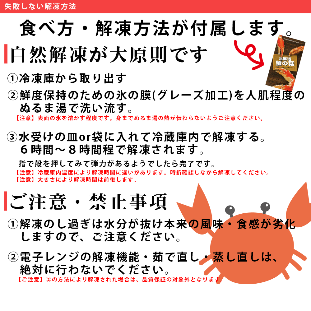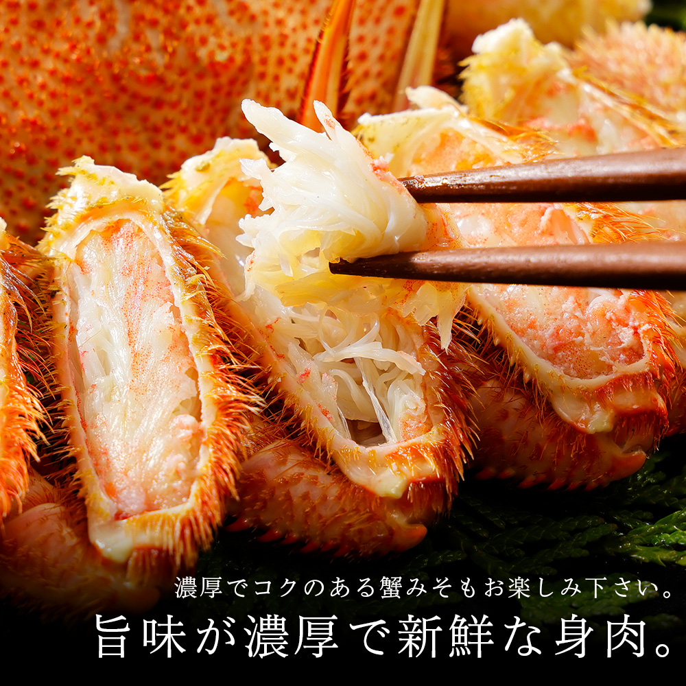 ※ズワイガニの場合、ハサミ脚から数えて5本目の足は非常に細く折れやすい脚のため、お届けの際についていない場合がございます。可食部分もほとんどないため、付いていなくても通常商品として販売しております。